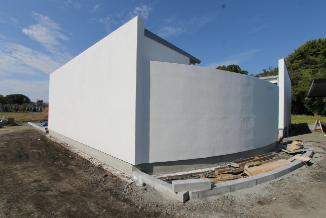 真っ白な塗り壁とアーチ壁が印象的な平屋のお家がいよいよ完成します♪